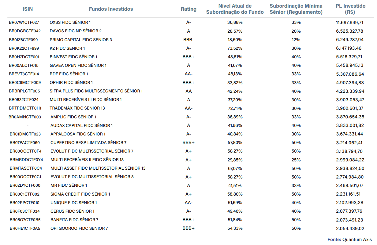 Outras categorias também são afetadas, como os FIDCs de precatórios e de crédito consignado. Isso ocorre tanto pela redução da demanda por crédito por parte de pessoas físicas nessa época, quanto pelo recesso do Judiciário.
